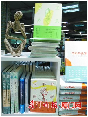 昨日,外图厦门书城把余光中的诗集《白玉苦瓜》放置在展台的最高处。 林晓云 摄