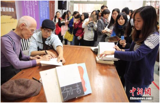 2015年12月15日,台湾师范大学举办余光中特展暨签书会,文学大师余光中致辞。余光中1950年来台湾,1992年才首次应邀回大陆。他受访时说,故乡变了,文化的乡愁是永远解不了了。图为余光中为“粉丝”签名。 中新社记者 陈小愿 摄