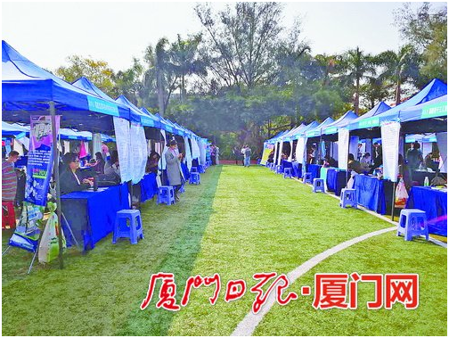 昨日上午9点,红色帐篷点缀在厦大上弦场草坪上,近500家招聘单位已经准备就绪。厦大学生就业创业指导中心的林智敏老师负责此次招聘会,他说,招聘会受到就业单位的极大欢迎。去年300多个单位参加,而今年开放报名仅三天,300个名额就已经爆满,不得不增加名额,最终扩容至473个。
