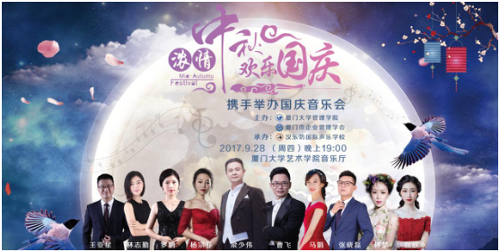 2017年9月28日晚,汉乐坊国际声乐学校国庆音乐会在厦门大学艺术学院音乐厅隆重举行,本场音乐会由厦门市大学管理学会、厦门大学管理学院校友办公室联合主办,汉乐坊国际声乐学校承办。