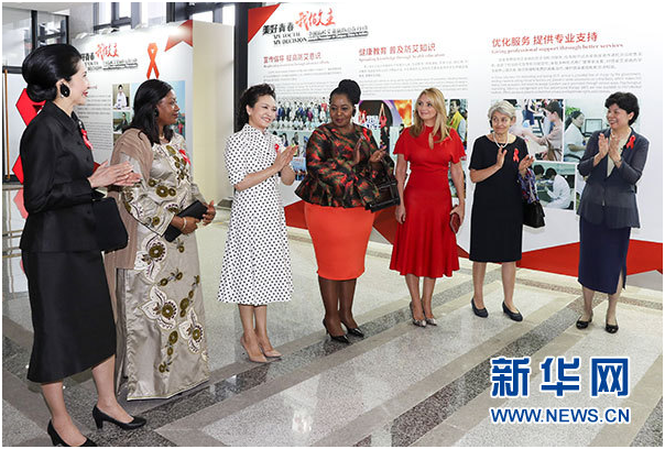 初秋的厦门大学校园生机勃勃,到处洋溢着青春气息。彭丽媛热情欢迎前来参加活动的南非总统夫人恩盖马、几内亚总统夫人杰内、墨西哥总统夫人里韦拉、泰国总理夫人娜拉蓬。她和来宾们一同走入科学艺术中心,参观中国高校艾滋病防治工作主题展,听取关于中国政府和高校开展防艾抗艾工作的情况介绍。中国卫生计生委负责人表示,“艾滋病防治宣传校园行”活动在中国国家主席夫人、世界卫生组织结核病和艾滋病防治亲善大使彭丽媛的倡导和推动下,近年已在中国50多所高校举办,受到青年学生热烈欢迎,吸引了一大批大学生志愿者和各界知名人士积极参与,社会影响不断扩大。来宾们观看了厦门大学师生以“防艾抗艾”为主题创作的雕塑、绘画、手工艺等艺术和文创作品,饶有兴致地欣赏并学习吹奏印有红丝带标志的瓷埙,详细了解厦门大学艾滋病毒检测诊断技术研究成果及在校园实际应用,并同大学生志愿者代表亲切交流。她们高度赞赏中国防艾抗艾工作成就,不时报以热烈掌声。