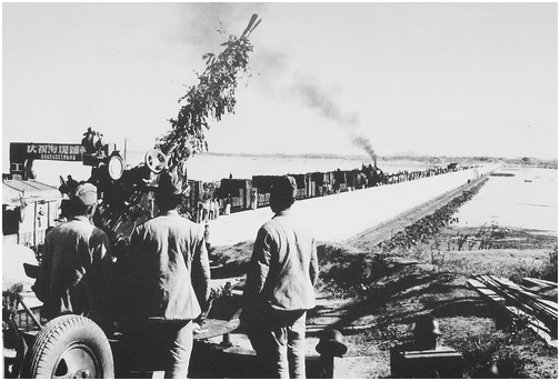 1956年冬,中国人民解放军铁道兵铺轨列车抵达厦门海堤,鹰厦铁路挺进厦门市。(原本报记者 李开聪 摄)