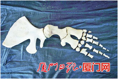 经过1个多小时,零散的250多块骨头“拼装”成一副完整的抹香鲸骨骼。这是上颌骨、下颌骨、脊椎骨、肋骨、指骨、胸骨、舌骨、V形骨、腰痕骨……董仁春熟练地为记者介绍。有趣的是,抹香鲸的鳍指和人的手一样,有着明显的五指结构。“右鳍有25节骨头,左鳍只有24节骨头,类似人小指位置上,两节骨头连在一起。”厦大生物博物馆馆长、厦门市水陆生物研究所所长童慎汉说,很可能,它曾经受过伤。