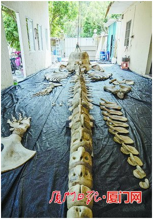 时隔一个月,昨日下午2时许,记者再次来到厦大生命科学学院科研教学实践基地,浓烈异味已无。数十平方的工作室铺上了一层黑色塑料网。黄荣福、董仁春老师正按抹香鲸骨骼结构,摆放着经过浸泡晾干的骨头。原先黑红色、油腻腻的骨头,经过18天的清水浸泡,好似“洗白”了。“骨头上90%的肉去掉了,加上油脂去了部分,异味就少了。”黄荣福说。