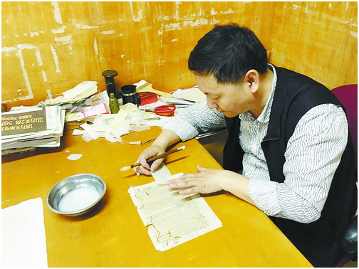 杜亚平正在修复破损书叶。(本报记者 王玉婷)