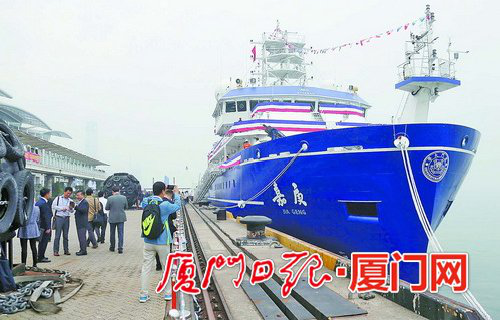厦大“嘉庚”号科考船吸引众人拍照留念。(本报记者 姚凡 摄)