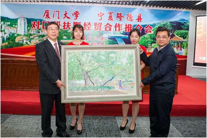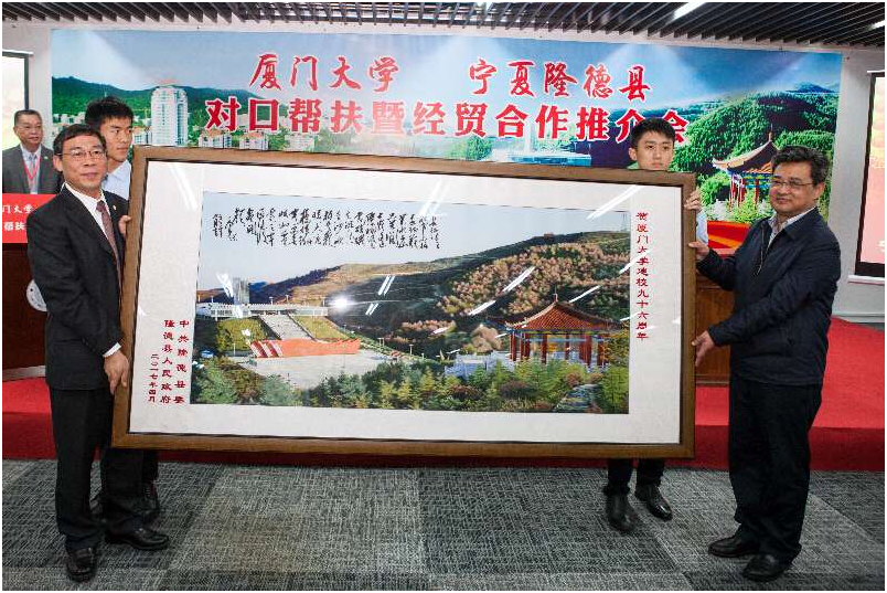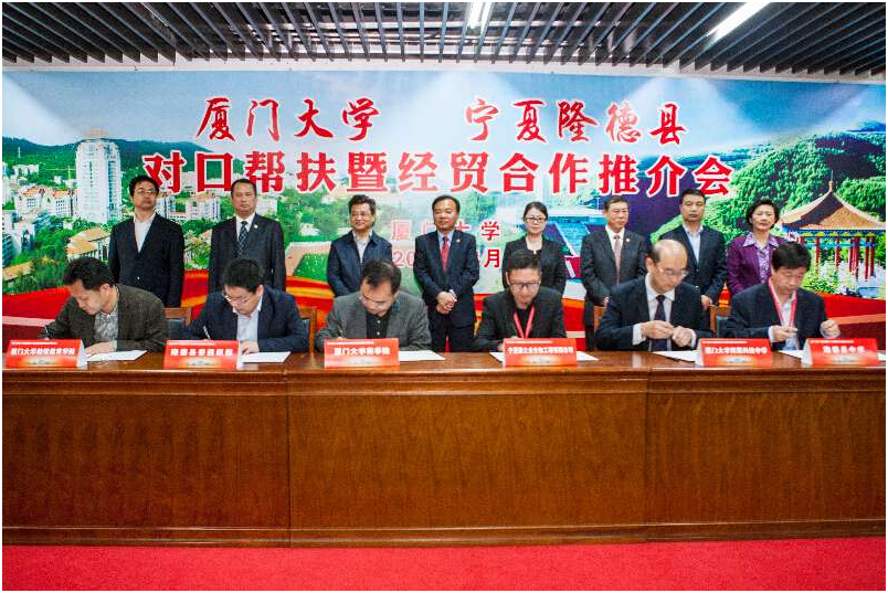 2012年底,根据中央部署,厦门大学与宁夏隆德县建立定点扶贫结对关系。目前,厦门大学已成功举办隆德县培训班6期,轮训学员300多名。校方经济、管理、法律、公共事务等学院的专家学者开设主题突出、实用性和针对性较强的专题讲座,受到了学员的热烈欢迎,同时厦门大学通过教育、科技、文化等多种途径和方式,结合发展需求和特色,更有针对性地协调校内资源,在招生、医疗人才培养、中医药研究、文化交流、西部支教、经济困难学生帮扶等全方面给予更多的支持,不断深化与宁夏隆德县的合作交流。