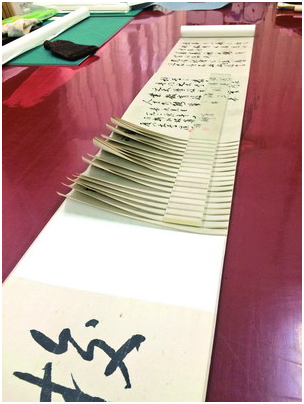 什么叫“龙鳞装”?谢华斌向我们展示了他制作的成品,初看上去,类似于一幅横式卷轴,只是打开的方向相反,是由左向右打开。不过打开之后,我们才发现大有乾坤,里面并非一幅平铺展开的书画,而是有着一列次第折叠、类似于书页的页面,页面间鳞次栉比排列,犹如鱼鳞。“最早中国的装帧都是卷轴,而这是更进一步的装帧技术,更方便收纳长篇的东西,也更方便查找、检索,可以像书一样进行翻找。比如这件龙鳞装卷底部分打开只有 96厘米,我做了20页书叶,记录了153行陈嘉庚先生曾经在演讲中说过的名言语录,可以很方便地翻开查看。如果是普通卷轴,这个卷底至少要做到 8 米,而且要找其中的一句要从头依序展开。”谢华斌说。
