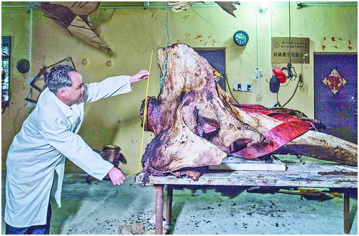 童慎汉还特意让人拿来二十多床棉被。“抹香鲸的脂肪非常厚,解剖时会流出大量油脂,地板都是滑的。”童慎汉说,如果人打滑,屠刀易伤人,必须用棉被来吸收油脂,确保安全。