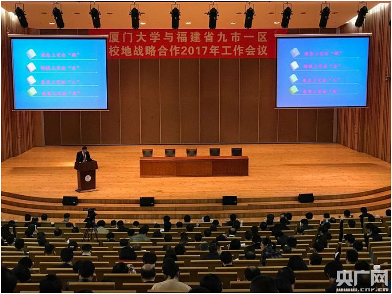 央广网厦门3月11日消息(记者 陈庚 通讯员 欧阳桂莲)厦门大学与福建省九市一区校地战略合作2017年工作会议今天在厦门大学召开,福建省有关部门及九市一区政府部门、企业代表、厦门大学领导及专家学者近500多人共聚一堂,以“展现新作为、再上新台阶、建设新福建”为主题,共同探讨如何深化校地校企合作,提升合作水平和成效,以更好地服务新福建建设。