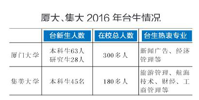 此外,集美大学招生办的相关人员也向晨报记者表示,今年集美大学共招收了45名本科台生,这些学生分布在集美大学的37个专业。其中,最受台生喜爱的专业是旅游管理专业,其他的则分别是航海技术、财经、工商管理等。
