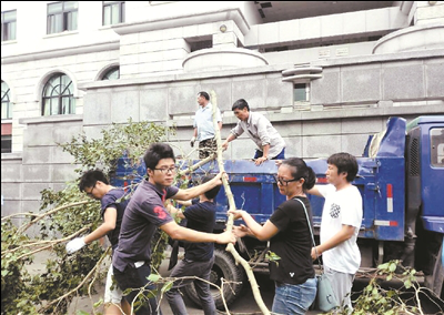 15日上午,厦大机关党委和校学生处、团委分别组织了师生灾后重建突击队,在微信群发出号召后,不断有人要求加入,大家一起帮助后勤部门清扫路面,保障道路的畅通。