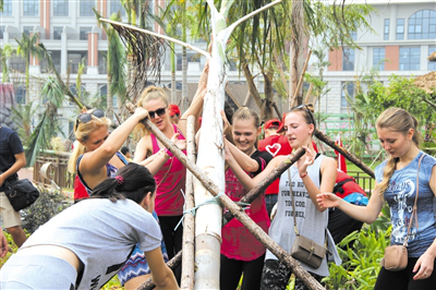 ▲灵玲马戏城来自俄罗斯、乌克兰、菲律宾等国家的外籍演员们正在扶树。