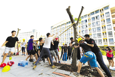 18日下午,近百名来自香港、澳门、台湾地区和泰国、缅甸、安哥拉等国家的境外生从泉州赶来,与厦门的境外生共同汇聚在华侨大学厦门校区灾后重建的现场,协助清理道路垃圾,扶植被台风灾害破坏的紫荆树。“紫荆花代表着香港,它象征着和睦亲情,也代表着内地和香港的紧密联系。”华大校学生会主席、香港学生吴静薇表示,“作为一名香港学子,也作为校学生会的一员,我们有义务自觉地帮助学校灾后重建。”
