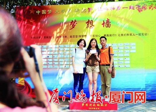 外文学院也选择用图像记录新生的大学初印象。在巨大的“梦想墙”下放着一个合影留念台,红色的台子寓意“梦想升起的地方”。每个新生都拿着梦想卡拍照,再写下梦想贴到背景墙上。负责迎新的学生介绍,假期里志愿者提前收集了新生的照片,做成梦想卡,每个新生来报到就能拿到一张印着自己照片、姓名、专业的梦想卡。这个温馨的小举动,让新生一来就拉近了距离。