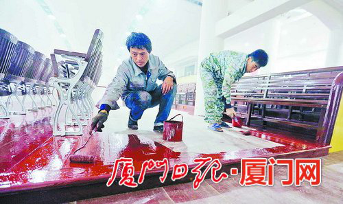 昨天,工人们在建南大会堂忙着做后期清扫。厦大资产与后勤事务管理处副处长吴爱仙说,从外表上,你看不出它的变化,只会觉得,它更“旧”了。譬如说,翻修之前,会堂的窗户是铝合金窗,这次全部恢复朱红木窗,是大会堂原来的样子。