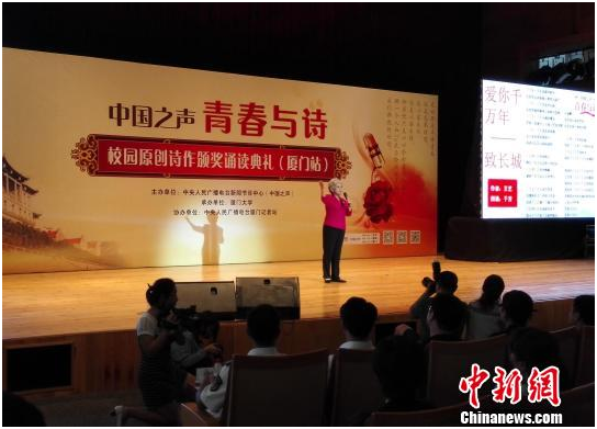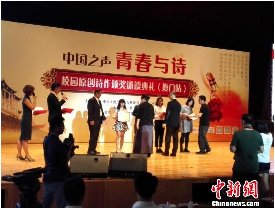 中新网厦门10月24日电 (记者 杨伏山)中央人民广播电台中国之声“青春与诗”校园原创诗作24日晚在厦门大学颁奖,由厦门大学、闽南师范大学、闽江学院学生创作的三篇诗作分获一等奖。