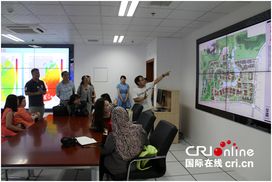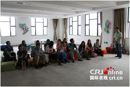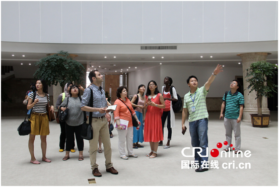 CRI中外媒体记者认真听取图书馆负责人讲解相关情况