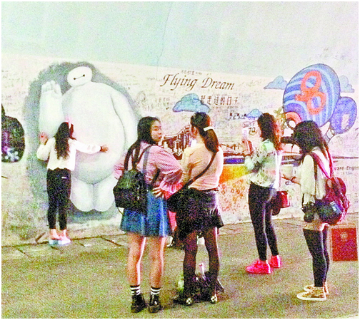 昨日下午,记者来到厦大芙蓉隧道。“大白”就在厦大本部校区这一侧进去不到百米处。许多厦大女生、游客都来和大白合影。有的女生更是激动地贴着墙壁与大白拥抱,表情甜蜜十足。“呆萌呆萌的,好可爱啊。”“好想趴在大白的肚子上睡觉。”女孩们一边拍照,一边嬉闹着。