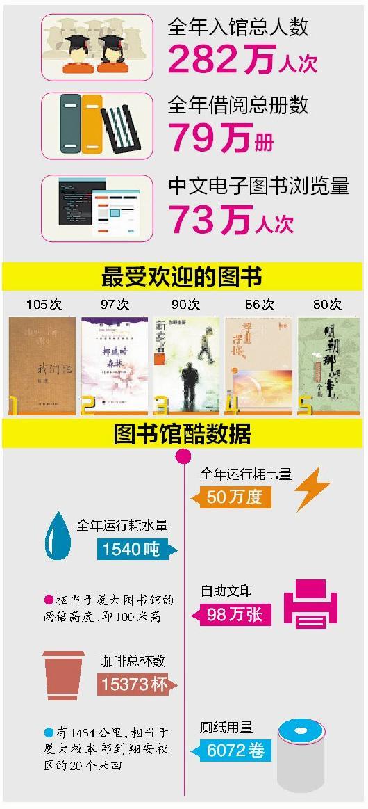 这也是厦大第二次公布图书馆萌“账单”,它统计的是过去一年里,厦大谁最爱泡馆?谁看的书最多?哪本书最抢手?等等。厦大图书馆是全国高校图书馆中最早做这类酷数据统计。馆方表示,希望它能使图书馆和人们更“亲”。