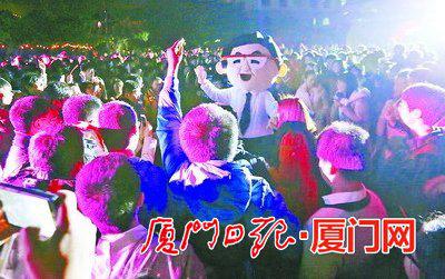 昨晚,卡通人偶扮演的“朱校长”与厦大学生们一起狂欢。(本报记者 张淇辉 摄)