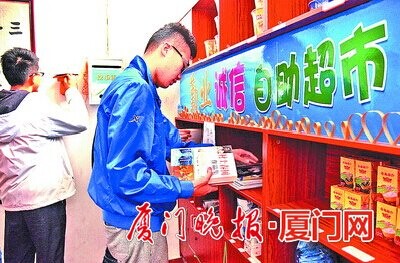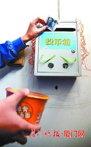 住勤业四宿舍楼的刘同学晚上打完球回到宿舍楼,在二楼楼道转角处,他顺手拿了一盒泡面和一瓶矿泉水,把钱往墙上的投币箱一投,付了账。如果没带钱也没关系,他可以自己登记一下,赊个账,下次再还。
