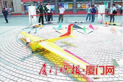 本报讯(文/图 记者 施璐玮)昨天中午,在厦大三家村学生广场,多架无人机、航模、滑翔机等机型,吸引了众多师生、游客的目光。制作者是厦门大学航模队,大多是大二到大四的学生。在刚结束的2014科研类全国航空航天模型锦标赛暨中国国际飞行器设计挑战赛中,他们获得了多项奖项。