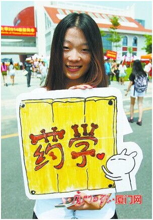 厦大各学院的老生都在比拼迎新创意。软件学院在展板上印二维码,新生掏出手机“扫一扫”,就加上了微信。新闻传播学院在注册点前,设置了一个采访区,新生手握话筒,对着摄像机接受学长学姐的采访。药学院走的是卖萌路线,院牌是手绘的,一个写着“药药”,另一个则是用骨头组成的“药学”字样,旁边还有一只兔斯基,由美女学姐举着。医学院则留住了新生报到时的心愿,在该学院的注册处,有一面心愿墙,每个新生都要写上自己的心愿,在贴上自己的心愿后,还要和心愿墙合影,待到毕业之时,这些照片和心愿纸会发到学生手里。