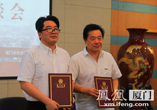 周宁(左)与周旻签字《合作举办鼓浪屿国际研究中心协议》
