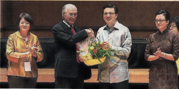 马中文化艺术协会会长陈凯希(左二)赠送礼品予为马中合唱交流会主持开幕的廖中莱(右二),左为周美芬,右为马珈。