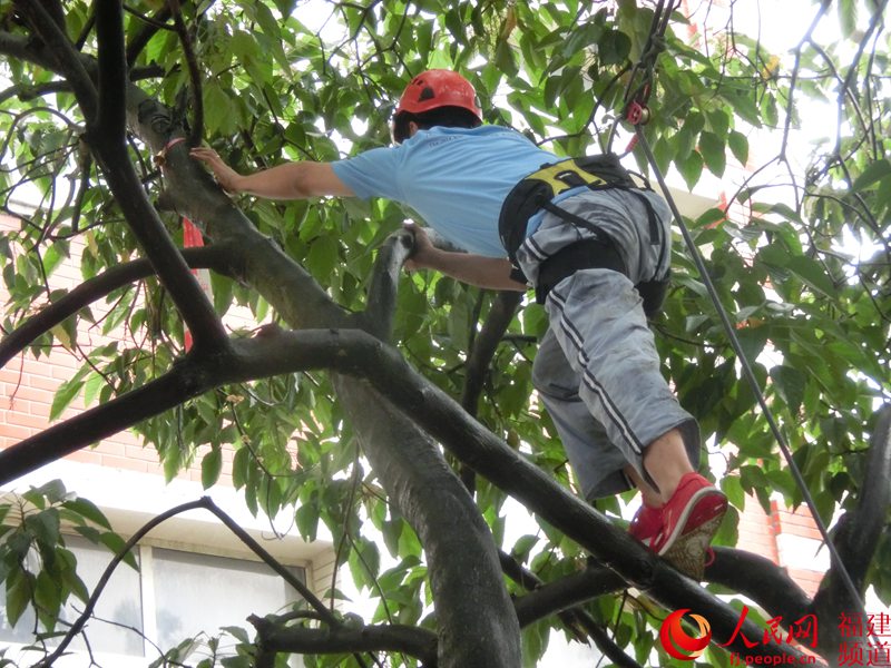 人民网厦门5月25日电 (江俊涛 郑达雄 陈超)中国大陆第一个按照国际树木协会《国际攀树赛事标准》执行的正规攀树比赛24日上午在厦门大学举办。此次比赛主题为“关爱树木、保护森林”,共设置抛掷绳索、速度攀爬和双绳脚锁三个项目,并额外设置了空中拯救、高空投靶、观赏性攀树三个表演项目。