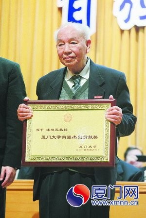 厦大四位平均年龄89岁的教授,昨日获得厦大“分量”最足的奖项——“南强杰出贡献奖”,每人获得奖励20万元。这四位获奖者分别是田昭武、唐崇惕、邓子基和潘懋元。他们当中,最年轻的85岁,最年长的94岁。