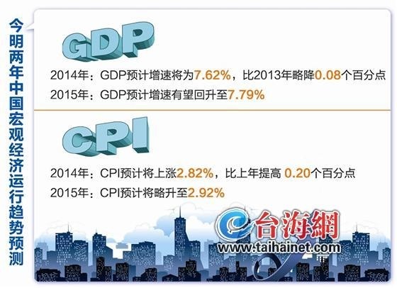 CPI(消费者价格指数)方面,则可望维持基本稳定。2014年,CPI将上涨2.82%,比上年提高0.20个百分点;到2015年,预计CPI将略升至2.92%。