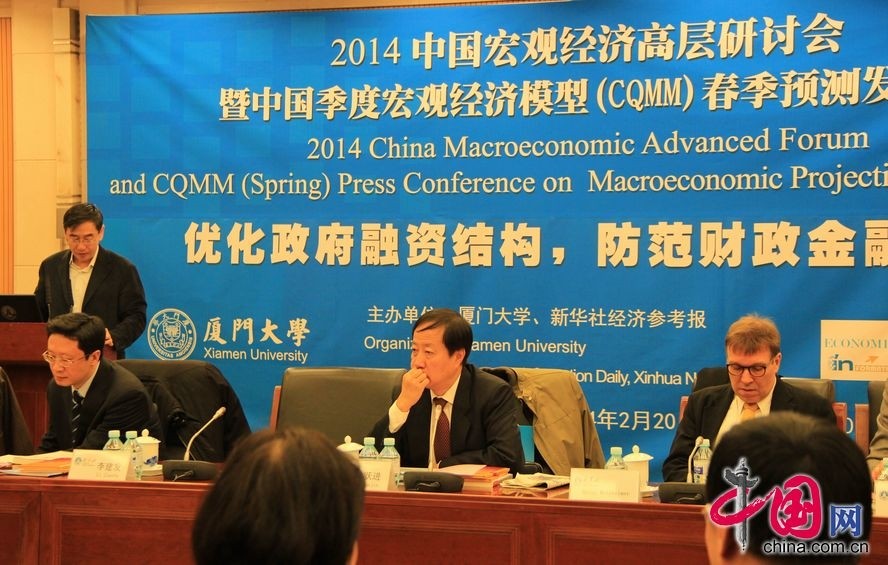 中国网2月20日讯(记者吴琼静)2月20日上午,由厦门大学与经济参考报联合举办的“2014中国宏观经济高层研讨会暨中国季度宏观经济模型春季预测发布会”在京举行。会上由厦门大学宏观经济研究中心发布“中国季度宏观经济模型课题研究组”最新的预测结果显示,2014年中国GDP增速将略降至7.62%,而到2015年,经济增长率有望回升至7.79%;2014年全年CPI可望持续基本稳定在2.82%左右。报告同时预测,本年度央行仍将维持紧平衡的货币政策,其中,二季度将实行相对宽松的货币政策,下半年将转向实行紧缩的货币政策。