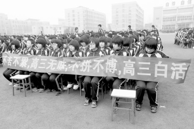 高考百日誓师大会正在成为一些中学每年的必备仪式。图为河北某中学2013年高考百日誓师大会现场,标语上匆匆写就的“不拼不博(搏)”显露出一丝浮躁气。闫楠/CFP