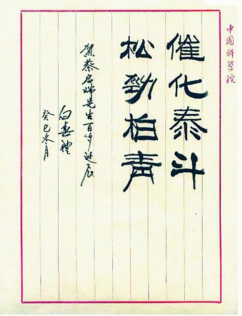 中科院院长白春礼为蔡启瑞题写的生日贺词