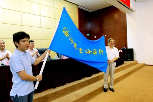 国家海洋事业发展高级咨询委员会委员陈明义(右)向海洋博士代表授旗