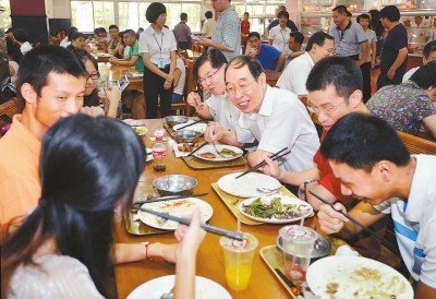教师节前夕,省委书记尤权来到厦门大学、集美大学看望教师,并致以节日问候。图为九日,尤权在厦门大学食堂与师生们亲切交谈、共进午餐。