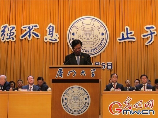 厦门大学校长朱崇实在致辞时介绍说,1921年4月6日是厦门大学的建校日,也是当年的清明节,陈嘉庚先生选择将清明节作为厦大的建校日是要让厦大的学子都懂得感恩,懂得感谢自己的祖国,懂得感谢养育自己的父母,懂得感恩栽培自己的师长,懂得感恩帮助过自己的朋友,懂得感恩所有给过自己滴水之恩的人!