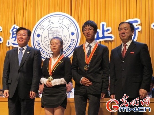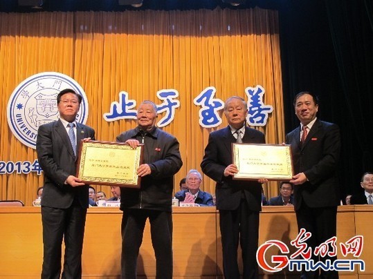 在当天举行的校庆大会上,厦门大学接受了若干的宝贵捐赠,并首次颁发厦门大学“南强杰出贡献奖”、厦门大学陈嘉庚奖章,我国著名化学家、中国科学院院士、化学化工学院蔡启瑞教授和我国著名经济学家、会计学家、管理学院葛家澍教授分别获得“南强杰出贡献奖”,厦大生命科学学院2010级研究生李阳同学和材料学院2010级本科生刘倩同学分别获得厦门大学陈嘉庚奖章。