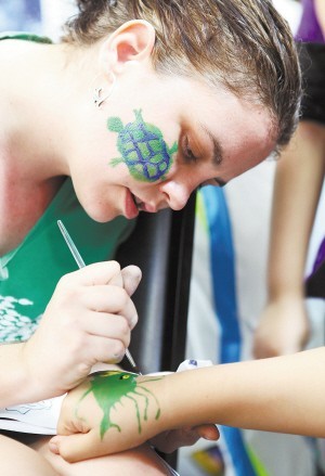 现场参观的老外将海底生物涂画在手上。常海军 摄