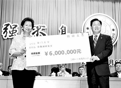是次向厦大捐赠的有:福建圣诺集团捐赠4000万元用于建设厦门大学圣诺有色金属研究院实验大楼及其附属设施;会计系校友王平、左敏、陈玮、石建兴、刘础瑞、王建国、陈国钢、崔维星等发起设立厦门大学会计学科发展基金,首批捐赠2100万元;校友亲属、菲律宾华侨佘施淑好女士和子女捐赠600万元用于在翔安校区建一座太阳能游泳馆;中国航空工业集团公司成都飞机设计研究所捐赠“价值不菲”的84套飞机部件和仪器设备供教学科研使用;集美学校委员会捐赠1000万元用于厦门大学法学图书馆建设;物理系校友、泛亚创投集团执行董事陈少杰捐赠1000万元设立学生创业基金;外文系校友、上海国和现代服务产业股权投资管理有限公司总裁朱德贞在去年出资200万元设立“德贞社会课堂基金”的基础上,今年又追加100万元。