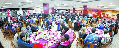 厦门网-厦门日报讯(记者 佘峥)厦门大学昨晚为没有回家的学生办了八十多桌年夜饭,传统中充满新意。而在吃年夜饭的人中,超过三分之一是老外。