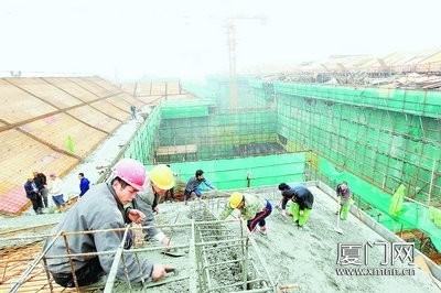 厦门大学翔安校区一期工程主体结构基本封顶。昨日下午,工人冒着小雨在屋面板进行混凝土浇筑施工。(本报记者 王火炎摄)