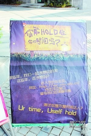 这10张有新意的海报引起了同学们的围观,让学生大呼“给力”。“那些年,我们一起浪费的时间。这些年,还浪费吗?”——这是以前段时间的话题电影《那些年,我们一起追的女孩》为亮点,提醒同学们要“hold”住时间。还有海报以“iphone”手机的界面为主画面,配上“夹带小抄品行低,当场查获零分计。通讯设备够先进,受到处分够伤心。代考着实不可取,既害人来又害己”的提示性语言,令同学们拍手叫好。对于这些海报,厦大林同学最中意游戏海报,他说,如果把考试比作游戏,它不是DOTA魔兽,而是拳皇,讲究单打独斗,过五关斩六将。