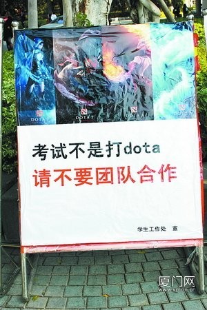 经历过大学校园生活的人,无疑对每个假期来临前的考试,以及贴在教学楼和宿舍楼各处的《诚信宣传》记忆犹新。不过如此潮的考试诚信宣传标语还真没见过。记者在厦门大学三家村广场宣传栏上看到10张由学校学生处制作的硕大宣传海报,其中一张上面写着“考试不是打DOTA,请不要团队合作”的宣传语,以“DOTA”这个大型网络游戏为亮点,用网游语言规劝学生,倡导学生在考试过程中自觉遵守考场纪律和道德规范,独立完成考题,杜绝抄袭或协同作弊。