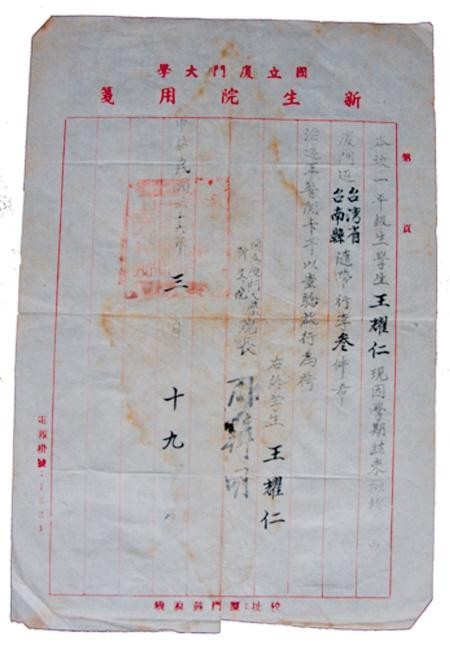 据王伯昌介绍,这张通行证是王耀仁在厦大就读第一学年结束返回台湾时所开具的。大致内容为,“本校一年级学生王耀仁现因学期结束拟由厦门返台湾省台南县,随带行李三件,希沿途军警关卡予以查验放行为荷。”信笺页眉和页脚分别有“国立厦门大学新生院用笺”和“校址:厦门鼓浪屿”字样,证上还有时任国立厦门大学新生院院长周辨明的签名。
