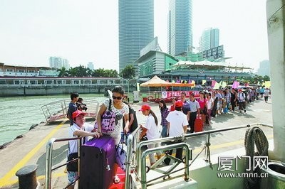 新生和陪同的亲友从厦门旅游客运码头登船前往漳州校区。 (本报记者 姚凡 摄)
