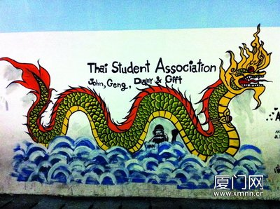 记者注意到,厦大涂鸦隧道不仅拥有美术系同学的专业级作品,还有来自建筑系、国贸系、旅游管理、会计系、音乐系、经济系、哲学系、环境科学等院系同学的作品。他们不仅画,有的还配上自己做的诗。每个院系的涂鸦带有自己专业的特点——比如音乐系的学生把自己创作的乐曲曲谱画了上去,建筑系的同学画了厦大的名建筑等,泰国留学生则画了老虎和龙。