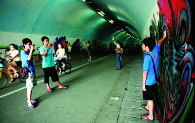 本报讯(记者 林晓云) 厦门大学风景如画,以前参观者多是在芙蓉湖边拍照,现在他们还去芙蓉隧道摆POSE——这是号称中国高校里最牛的一条涂鸦隧道,隧道内墙面上满满都是学生们的创意涂鸦作品,很多都是毕业生的“心血之作”。近日,厦门大学2011毕业季涂鸦活动结束,新作品亮相又引来络绎不绝的参观者。